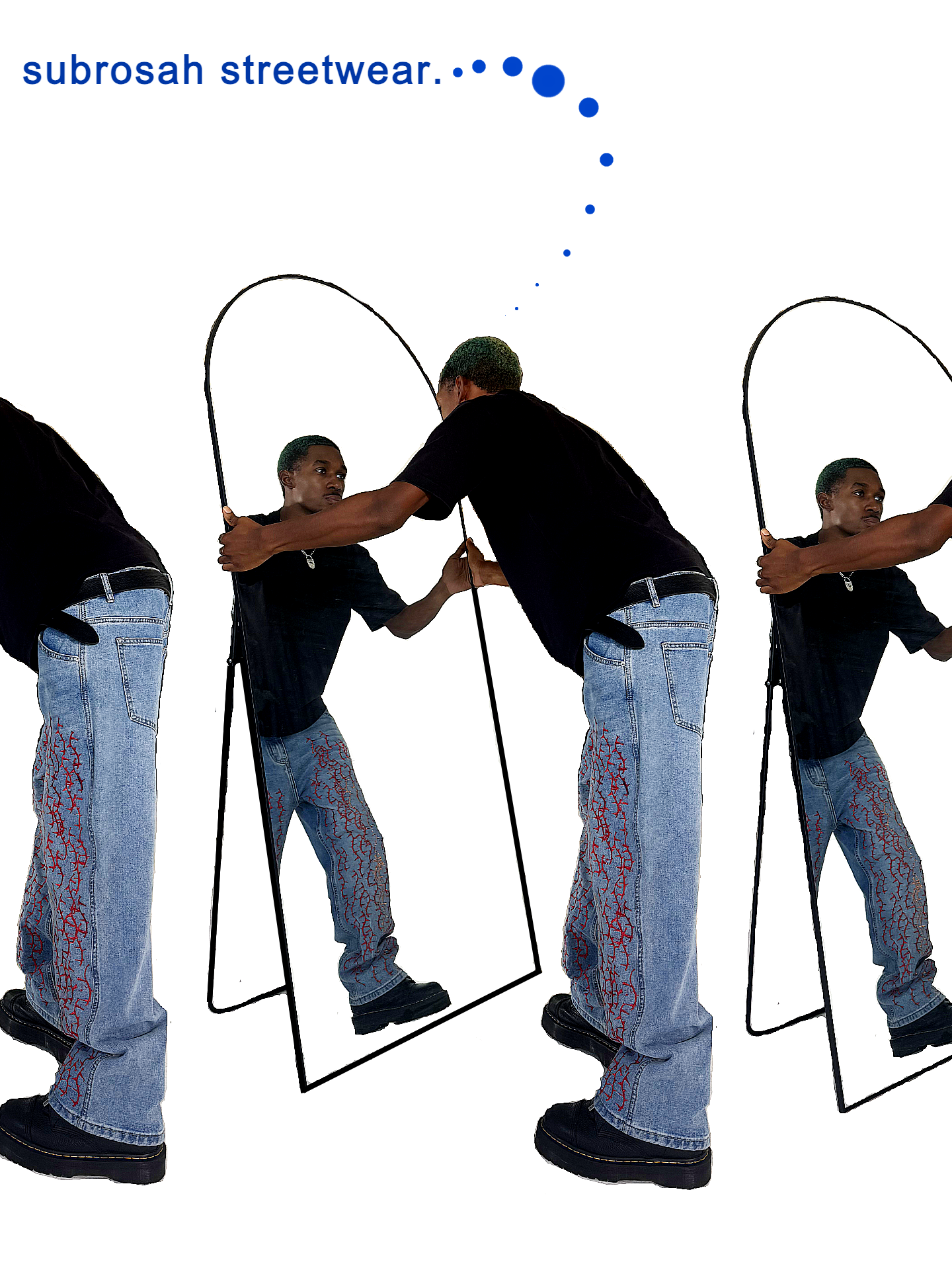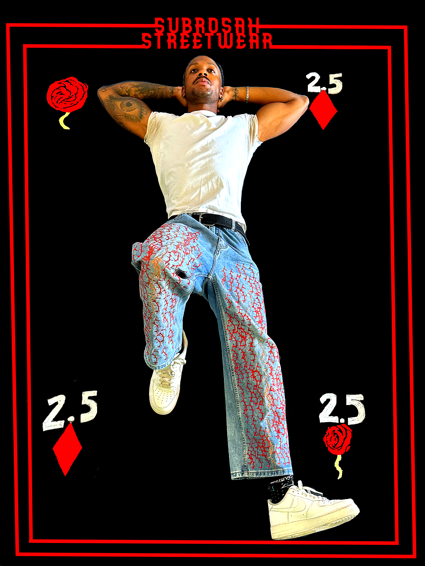 For Subrosah Streetwear Season 2.5, the 4K Jean intertwines blue denim with a cascade of the stem insignia in metallic fiery tones. Made in Los Angeles.